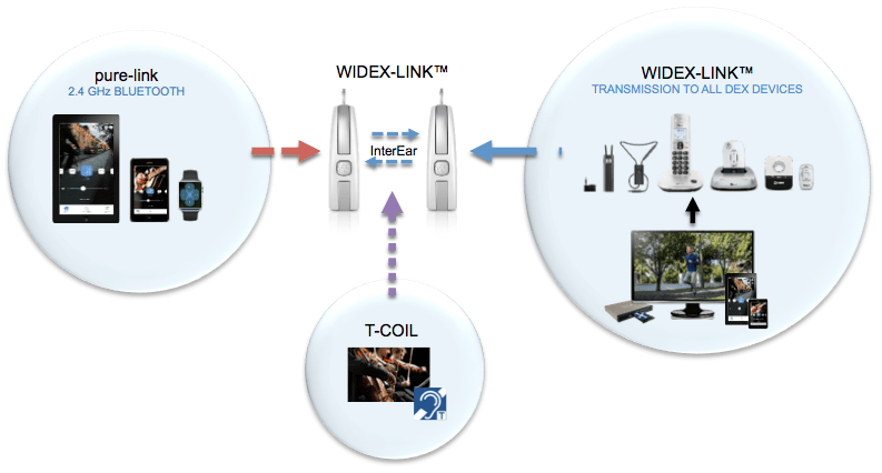 Hay audífonos que utilizan bluetooth, wi-fi, FM para conectarse tanto entre ellos como con los diferentes dispositivos con los que podemos complementar el uso de audífonos. Widex en cambio tiene su propia conexión inalámbrica llamada Widex link, la cual, está considerada una de las conexiones mas rápidas del mercado.